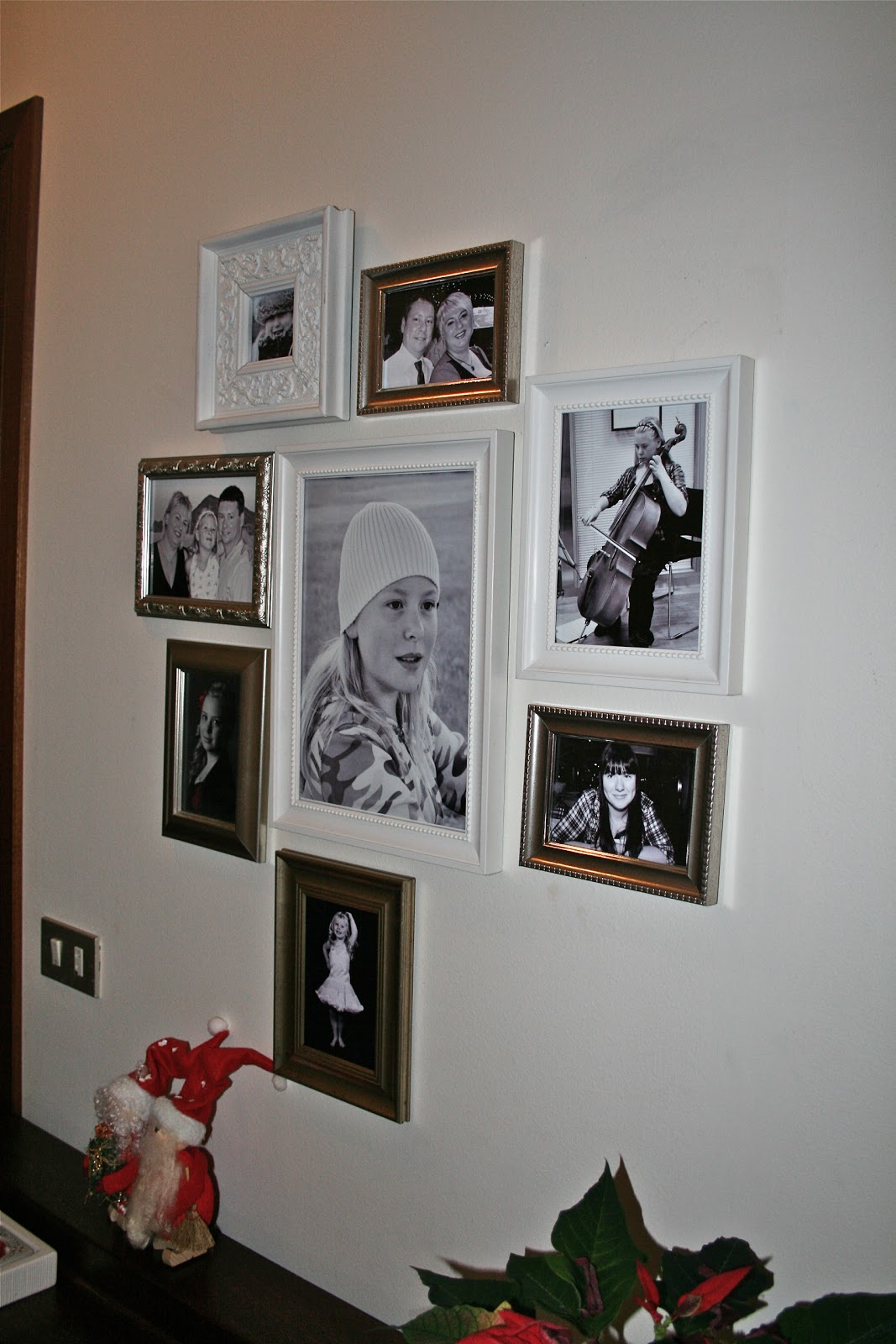 Annað verkefni sem hefur lengi verið á tú dú listanum mínum fór loks í framkvæmd rétt fyrir jól. Að hengja upp fjölskyldumyndir. Það er bara eitthvað svo huggulegt og heimilislegt við það. Rammarnir eru héðan og þaðan, nokkrir áttu einmitt orðið lögheimili í einni hrúgunni í vinnuherberginu og biðu þess að fá æðra hlutverk.